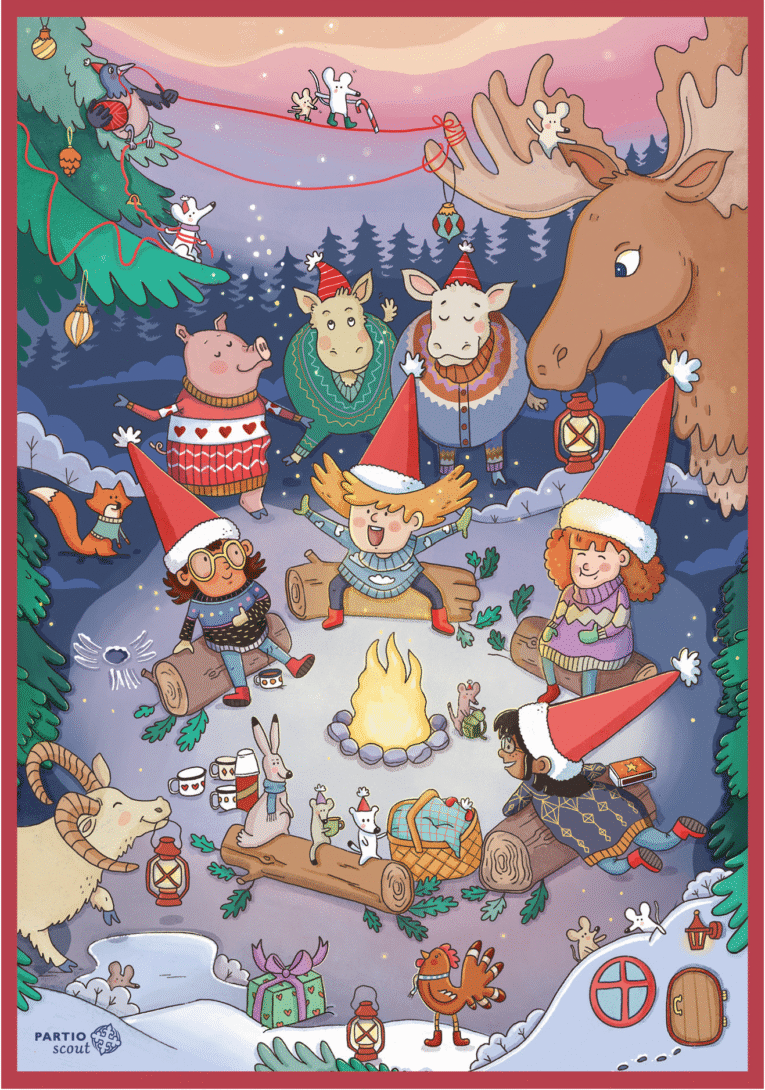 Keskellä lumista joulutoria kohoaa valaistu joulukuusi, jonka latvassa kimmeltää valtava tähti. Partiolaisten vuoden 2024 adventtikalenterin kuvituksen on loihtinut Henna Ryynänen.